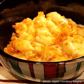 FOR THE TOPPING: mix the crumbs, melted butter and Parmesan cheese with a fork. Spread this evenly over the pasta and cheese sauce and bake at 375 for 10-20 minutes, until golden brown on top. Let it cool for 5 or 10 minutes before serving. This is how my mom taught me 50 years ago and it's still my favourite.