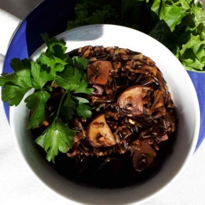 Press Saute on the Instant Pot and while it's heating up, slice the mushrooms, dice the onion and peel and mince the garlic. When the display says Hot, add the butter and mushrooms. Saute for a few minutes until it's starting to brown nicely and then add the onion. Continue to saute and stir for 2 minutes. Press Cancel and immediately stir in the garlic to cook it slightly as the pot cools.