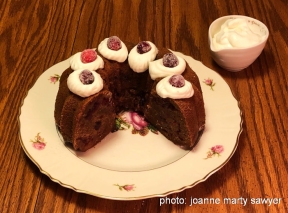 Spray a bundt pan, cake pan or cheesecake pan with baking spray. (You can also use ramekins or egg molds if you like.) Pour a little less than half the mixture into the pan and then add about half the cranberry compote. Add the rest of the batter. Top with the remaining cranberry compote and drag a knife or spoon gently through it for a marbled effect.