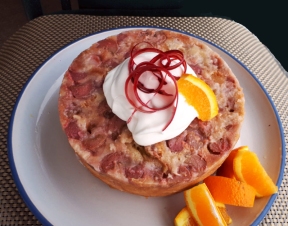 Let the cake cool on the counter. When ready to unmold, fold a tea towel in four and run it under hot tap water. Wring it out and set the bottom of the pan on it for 30 seconds or so. This will help the rhubarb layer to release from the pan. Invert the cake onto a plate and slowly remove the pan.