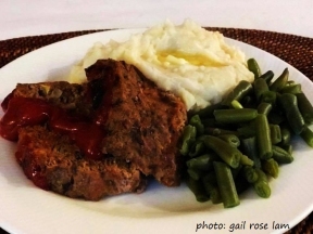 For the meatloaf: whisk together everything except the meat and then pour it over the meat and gently squish it all together with your hands. (Relive your childhood a little – pretend it's a mud pie.) Put the meat mixture in a loaf pan, ring pan or make your own tinfoil “pan.” Shape the meat into a loaf on a piece of tinfoil and fold the sides up around it. Make a 1/2-inch deep depression down the center of the meatloaf for the glaze that you will add later. Put the meatloaf on top of the trivet over the potatoes.