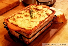 Spray a baking dish (or individual baking dishes) with cooking spray and pour the meat mixture into it. Spoon or pipe the mashed potato mixture on top. (My mom used to spread the potatoes over the top and then drag a fork over them to form rows. It was pretty. I still do this.)
