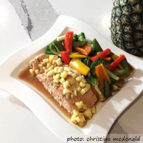 Place salmon in an oven-safe baking dish you have sprayed with cooking spray. In a bowl, mix together the soy sauce, fish sauce (if using), water, pineapple juice, ginger and garlic. Pour this over the salmon and add the pineapple pieces. No need to cover this container.