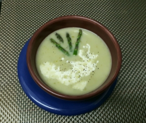 Reserve some pretty asparagus tips for garnish and add the rest to the soup. Blend the soup with an immersion blender or carefully pour into a blender or food processor. Return the pureed soup to the pot.