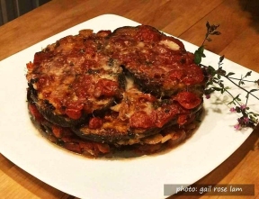 If you like, pop this under the broiler for a few minutes to brown the top but whether you do this or not, let it sit on the counter for 10 minutes or so before removing the outer ring. It needs time to set or it may fall apart. Then run a knife around the edge and remove the outer ring. Use a spatula to loosen the bottom and slide the lovely Eggplant Parmesan onto a plate.