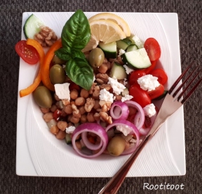 In a large bowl, combine the chickpeas and vegetables. Toss with dressing. Serve topped with the marinated onions, olives, nuts and Feta cheese.