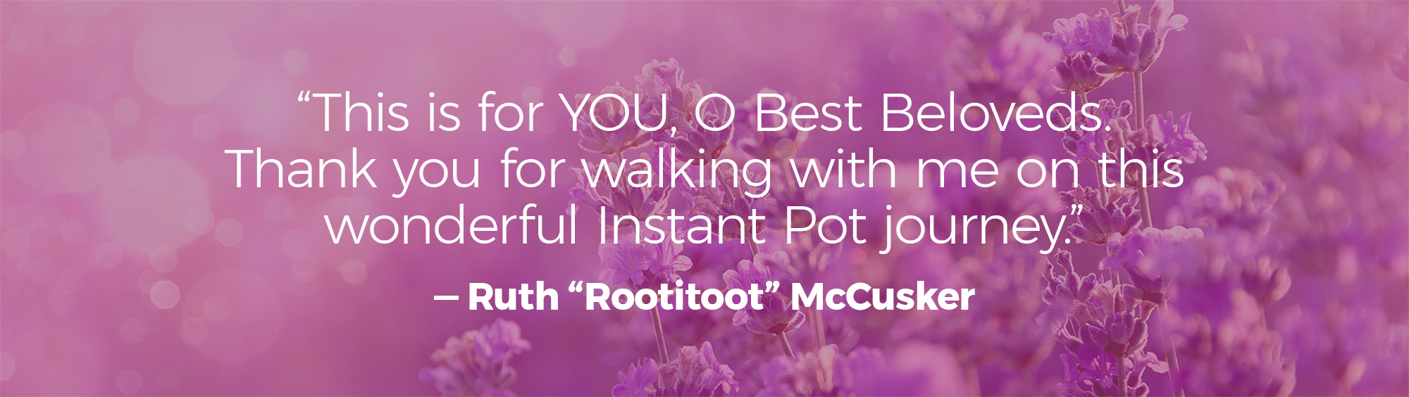 Our beloved Ruth is widely known for adapting her family recipes for use with the innovative cooking appliance known as the Instant Pot®, for the enjoyment of everyone. The product of her research and development was The Rootitoot Cookbook, Volumes 1 and 2. She also shared her expertise and passion freely in social media. Her reputation for exceptional recipes spread far and wide.